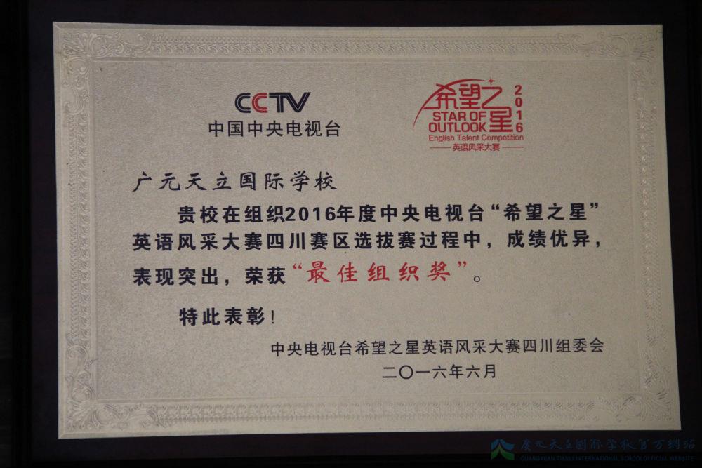 热烈祝贺广元天立国际学校在希望之星英语风采大赛四川赛区被授予“最佳组织奖”