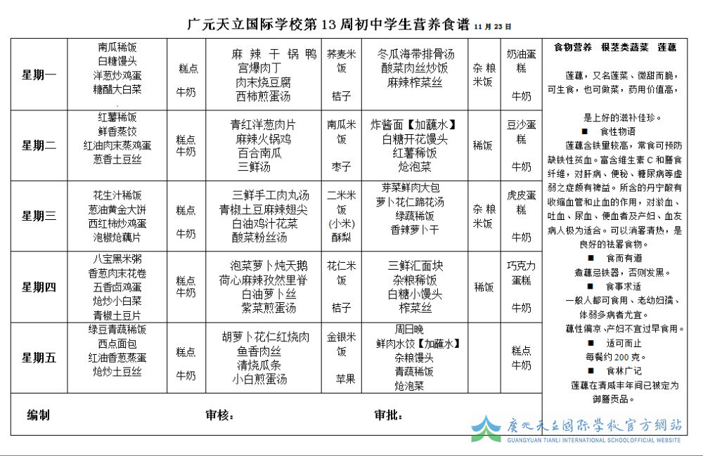 广元天立国际学校第13周初中学生营养食谱11月23日