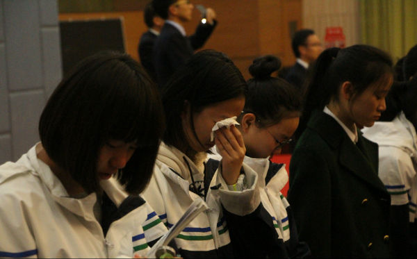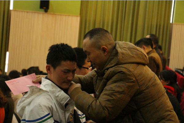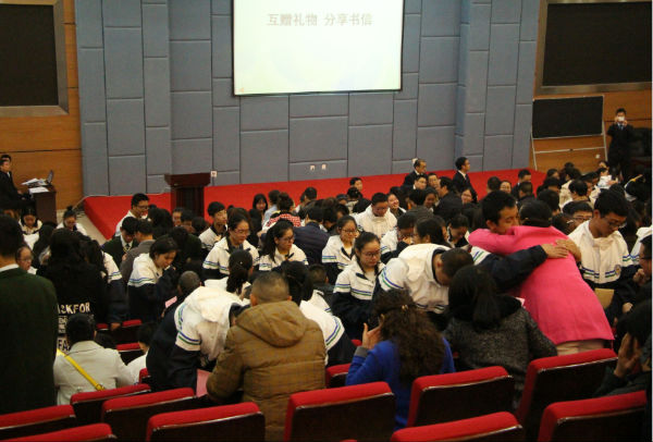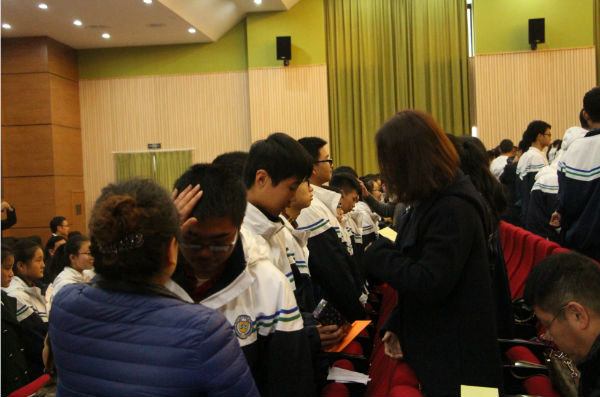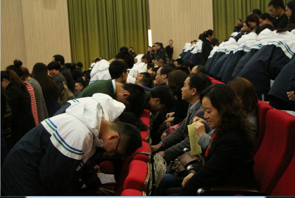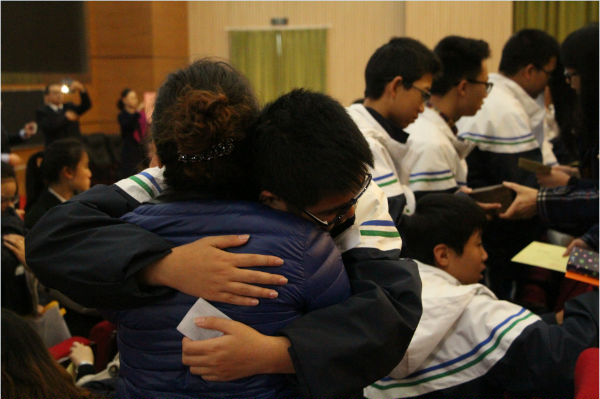 古有鱼传尺素,雁足留书;今者情流笔尖,把爱传扬。一封简单的书信记录着孩子们的点点滴滴,传递着他们平日里不愿表露的真情厚意;一份小小的礼物代表着父母的仔仔细细,承载着他们忙碌中偷藏着的款款深情。典礼现场,我们共同见证了这伟大的父慈母爱,孩子们也为父母送上了自己真挚的祝福。泪水模糊了双眼,拥抱温暖了人心,整个大厅被温情充斥着,如果时间可以静止,想必他们也希望这一刻能被永远定格。音乐久久没有停止,感恩远远不止此时,愿高中学子能铭记这温暖的一刻,让理解与孝敬从今天开始,为父母的恩情三鞠躬: