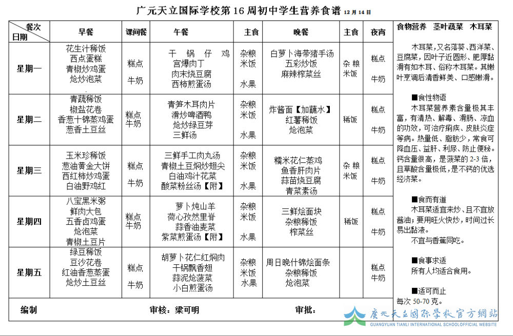 广元天立国际学校第16周初中学生营养食谱12月14日