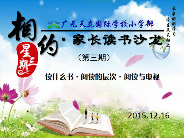 2015年12月16日晚上6:30-8:00,广元天立国际学校“相约星期三”家长读书沙龙第三期活动如期举行。本次活动由小学部俸耀旭校长主持,参与读书沙龙的家长及老师共65人,其中不仅包含关心教育、热爱阅读的老师家长,而且有更多的社会人士参与其中。本次的“相约星期三”,俸耀旭校长重点讲了“阅读与电视”的相关话题,舒凯老师分享了“蜀道”课程,各位家长也自由发言,参与到热烈的讨论中。