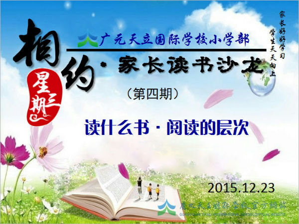 2015年12月23日晚上6:30-8:00,广元天立国际学校“相约星期三”家长读书沙龙第四期活动如期举行。本次活动由小学部俸耀旭校长主持,参与读书沙龙的家长及老师共68人,其中不仅包含关心教育、热爱阅读的老师家长,而且有更多的社会人士参与其中。本次的“相约星期三”,俸耀旭校长重点讲了“孩子应该读什么书”以及“阅读的层次”等相关话题。