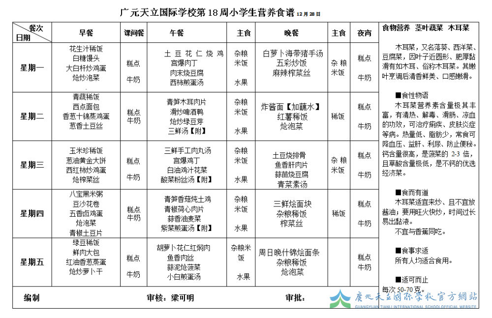 广元天立国际学校第18周小学生营养食谱12月28日