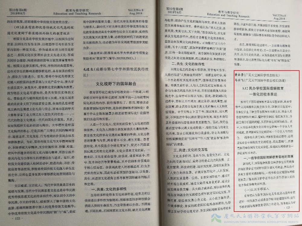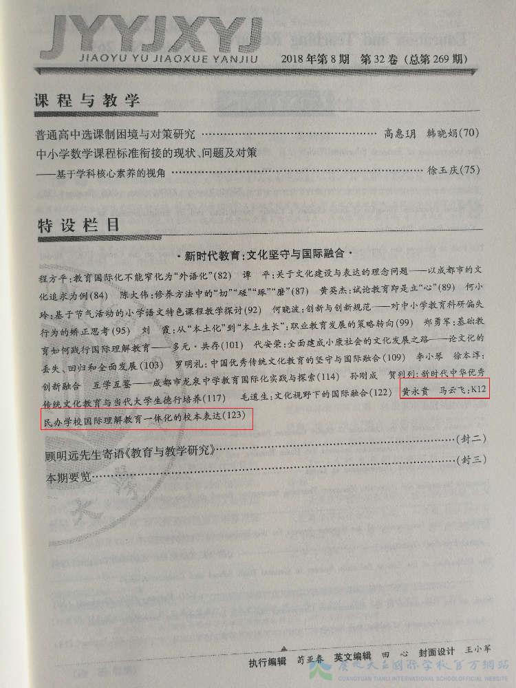 近日,我校总校长黄永贵、总校长助理马云飞联撰的《K12民办学校国际理解教育一体化校本表达》在《教育与教学研究》杂志2018年第8期“教育争鸣”栏目刊发。