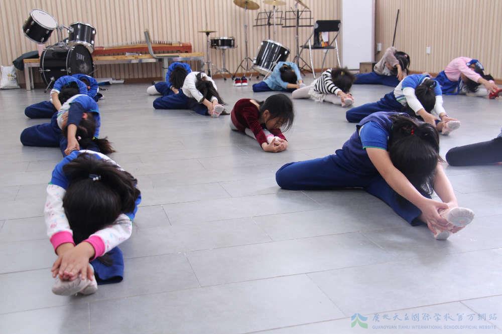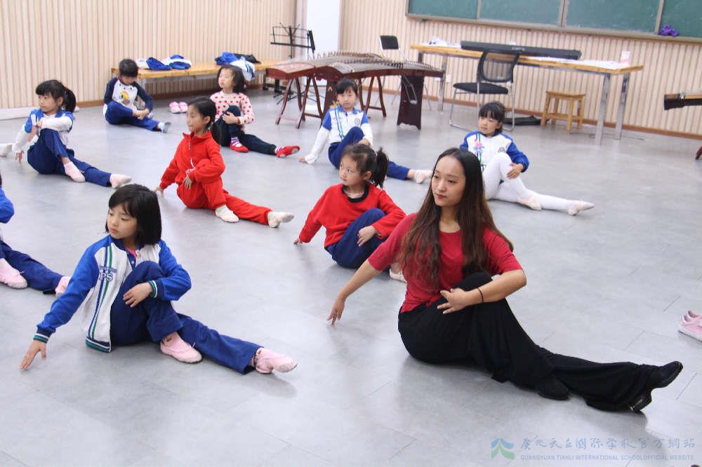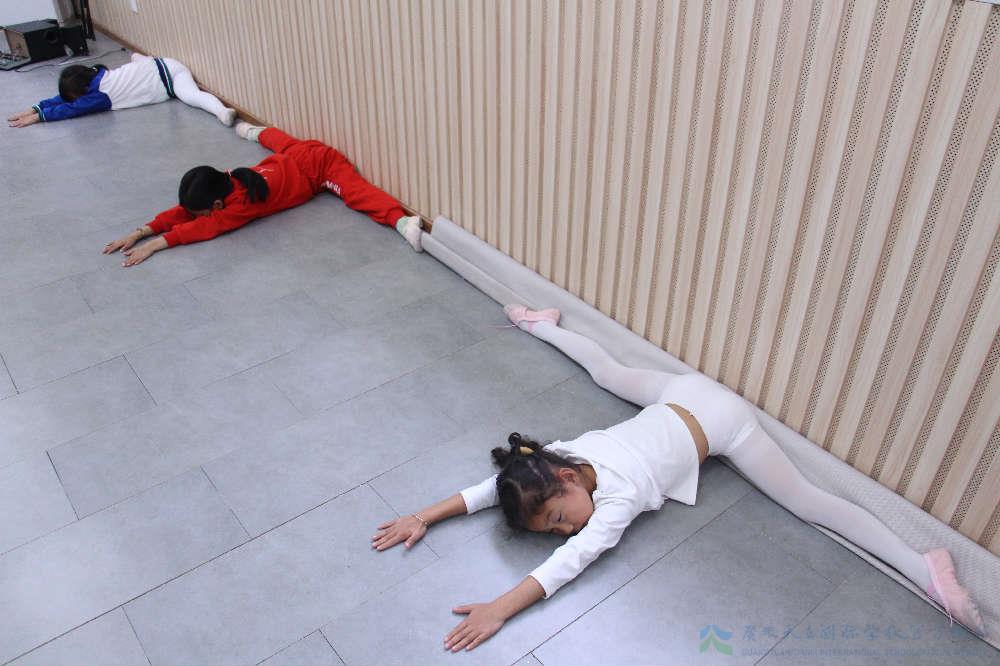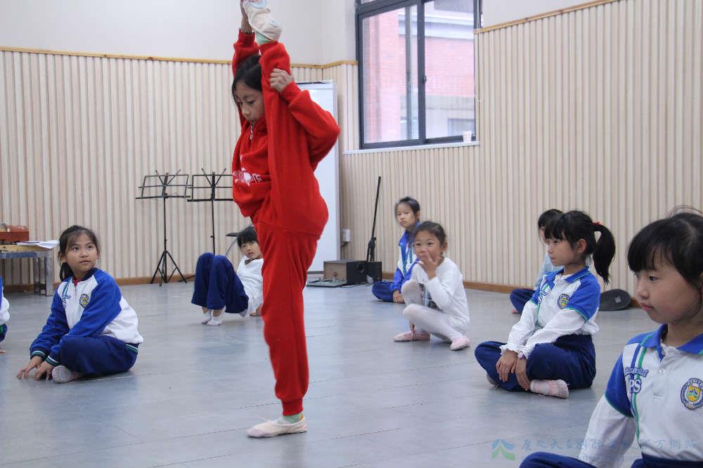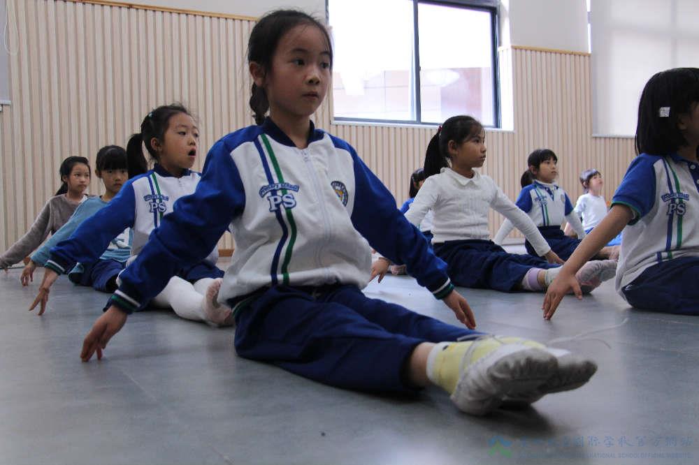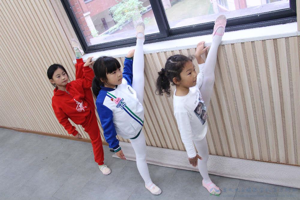 基础训练:中国舞的学习过程非常辛苦。每节课的前半小时,孩子们都要进行基本功的训练,主要针对肩、腰、腿、胯、脚背等进行柔韧度训练,以及背部、腹部、脚腕等部位进行力量训练。在这种枯燥、艰苦的基本功训练中,为了让孩子们学得更感兴趣,负责授课的陈老师特意把基本功训练揉合在好听的歌曲中,孩子们一边感受着他们喜爱的音乐,一边做着艰苦的训练,压腿、弯腰的疼痛感好像也不是那么明显了,孩子们的柔韧度和局部力量上有了很大的提升。