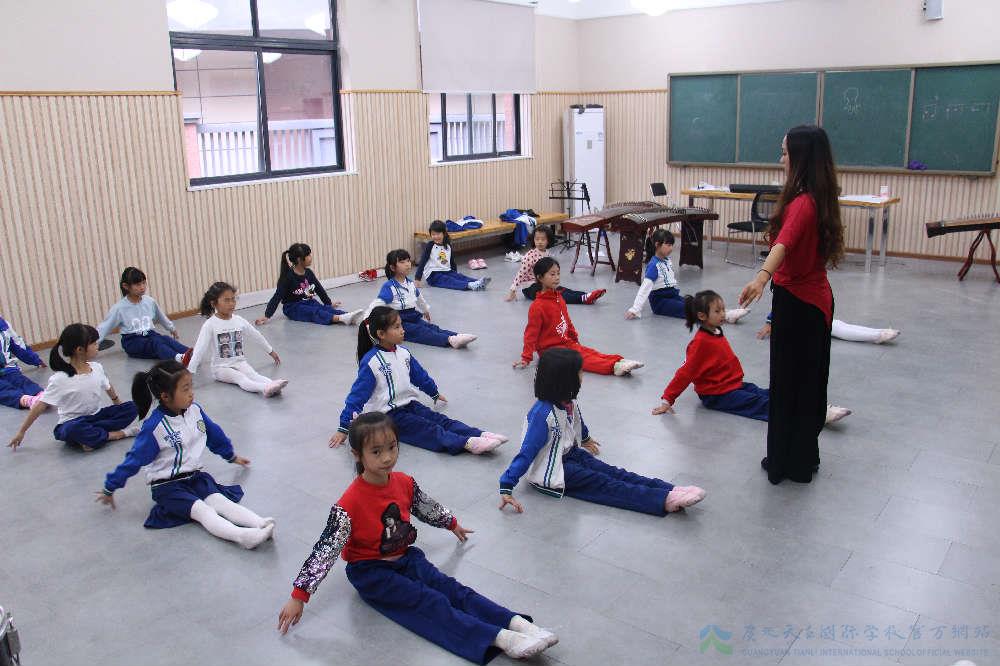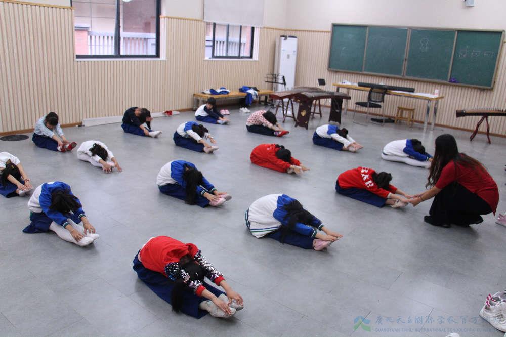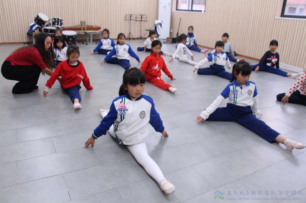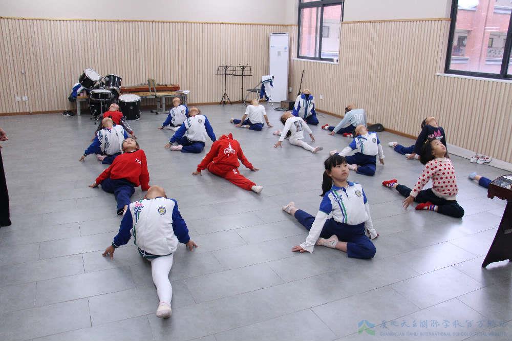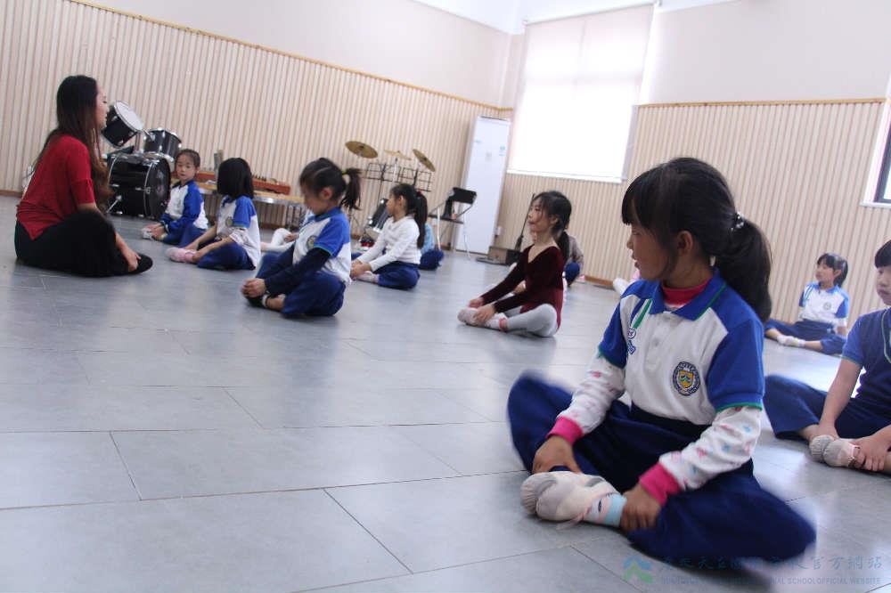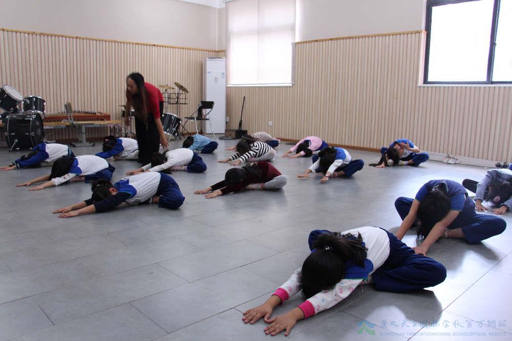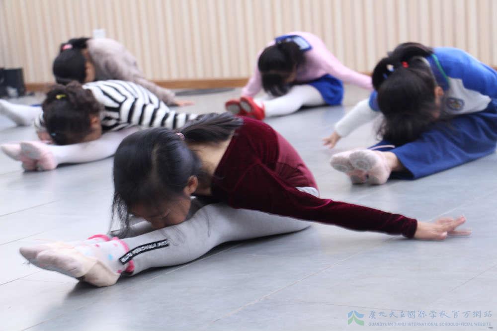 基础训练:中国舞的学习过程非常辛苦。每节课的前半小时,孩子们都要进行基本功的训练,主要针对肩、腰、腿、胯、脚背等进行柔韧度训练,以及背部、腹部、脚腕等部位进行力量训练。在这种枯燥、艰苦的基本功训练中,为了让孩子们学得更感兴趣,负责授课的陈老师特意把基本功训练揉合在好听的歌曲中,孩子们一边感受着他们喜爱的音乐,一边做着艰苦的训练,压腿、弯腰的疼痛感好像也不是那么明显了,孩子们的柔韧度和局部力量上有了很大的提升。