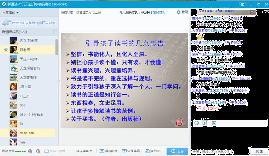 当晚,在近两个小时的精彩讲座中,聂军老师从“国学的外延与我们的探索”、“国学与应试”、“语文学习的三境界”、“一个孩子的‘问道’之路”等宏观、中观和微观三个维度向大家具体回答了“为什么要学习国学”“如何才能学好国学”等问题,并向家长如何引导孩子读书提出了很多中肯的建议。讲座理论与实操紧密结合、方法与案例相互支撑,受到了参与视频连线的学生及家长的一致好评和广泛赞誉。