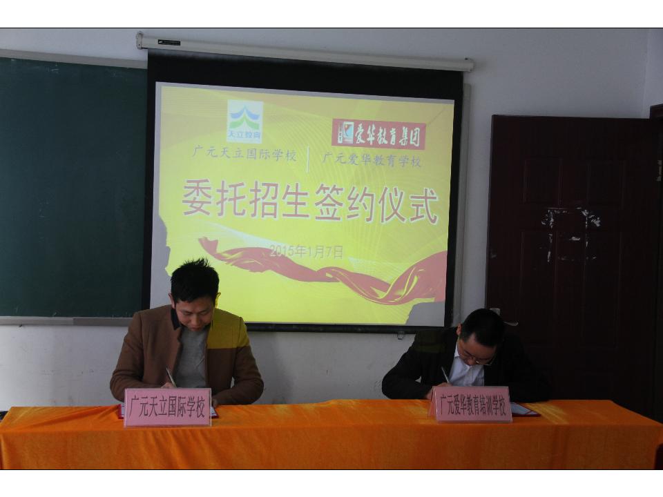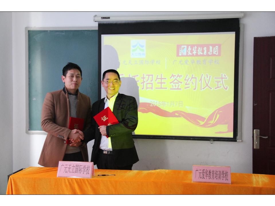 2015年1月7日15:00,广元天立国际学校招生组程思文主任与爱华教育集团广元总部王均贤副校长在该校成功举行授权委托招生签约仪式。签约前,双方融洽的交换了意见与想法,并介绍了学校目前情况,王校长早就期盼广元能拥有一所广元老百姓自己的名校,并表示大力支持我校招生事宜。即日起,也标志着我校在该片区的招生联系点正式启动!热烈欢迎广大莘莘学子到该校招生联系点踊跃报名。