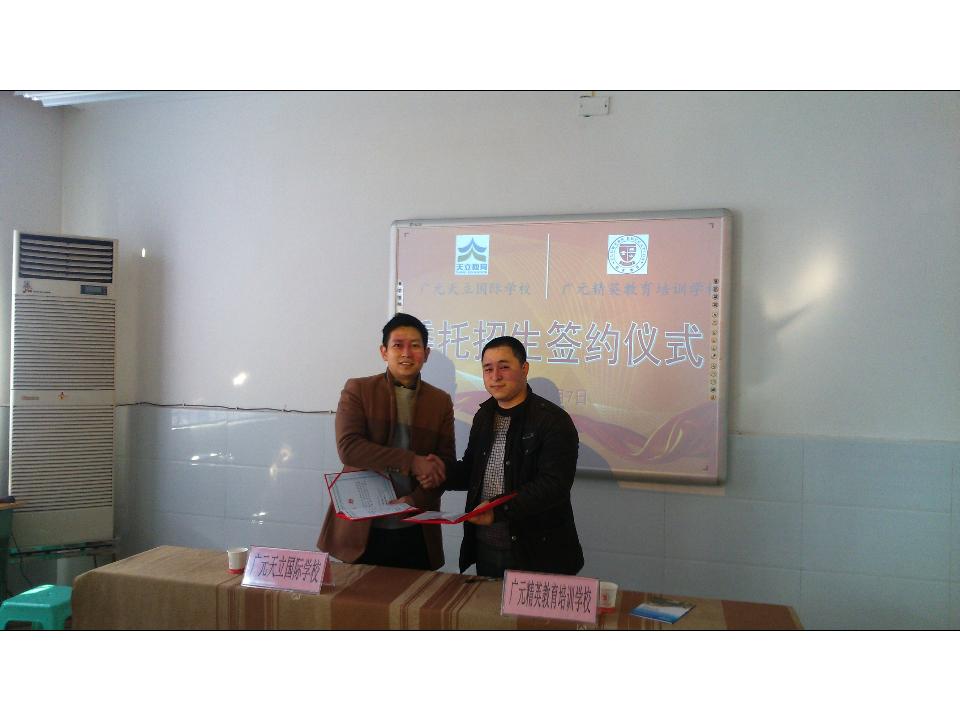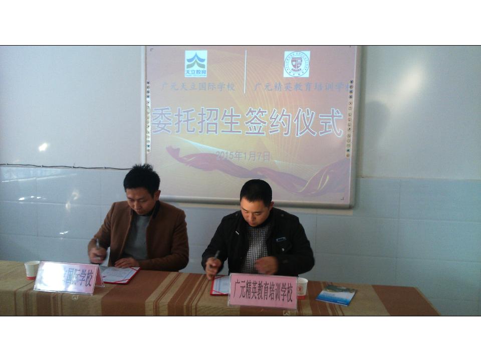 2015年1月7日10:00,广元天立国际学校招生组程思文主任与广元精英教育培训学校彭庆校长在该校成功举行授权委托招生签约仪式。签约前,双方融洽的交换了意见与想法,并介绍了学校目前情况,彭校长早就期盼广元能拥有一所广元老百姓自己的名校,并表示大力支持我校招生事宜。即日起,也标志着我校在该片区的招生联系点正式启动!热烈欢迎广大莘莘学子到该校招生联系点踊跃报名。