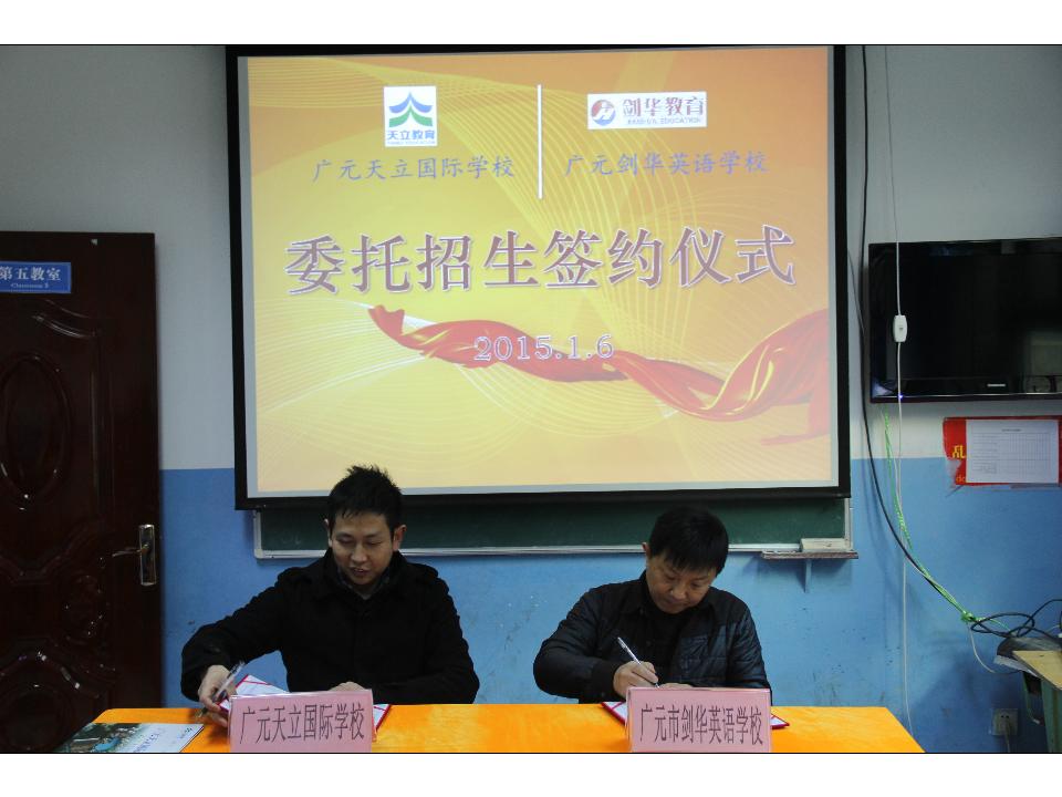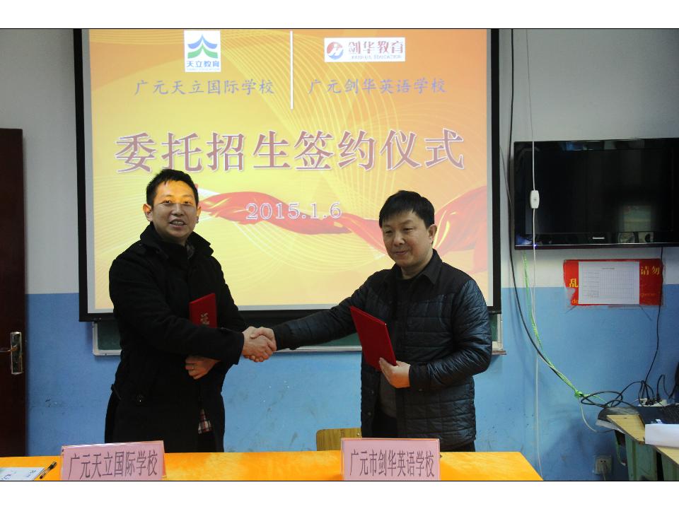 2015161000,广元天立国际学校招生组程思文主任与广元市剑华英语培训学校殷林校长在该校成功举行授权委托招生签约仪式。签约前,双方融洽的交换了意见与想法,及介绍了学校目前情况,殷校长早就期盼广元能拥有一所广元老百姓自己的名校,并表示大力支持我校招生事宜。即日起,也标志着我校在该片区的招生联系点正式启动!热烈欢迎广大莘莘学子到该校招生联系点踊跃报名。