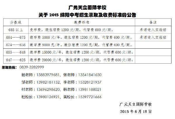 广元天立国际学校关于2015绵阳中考招生录取及收费标准的公告