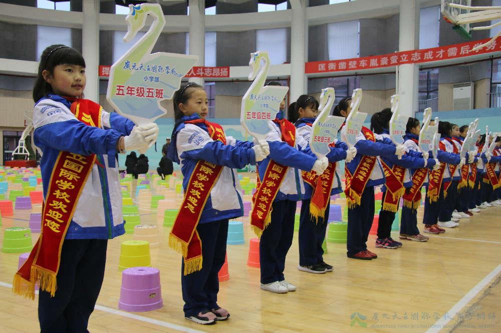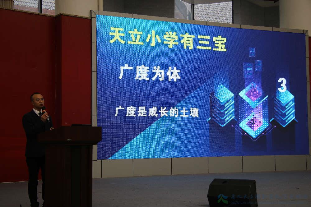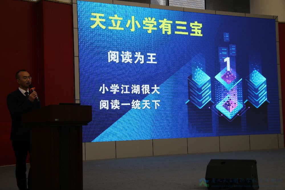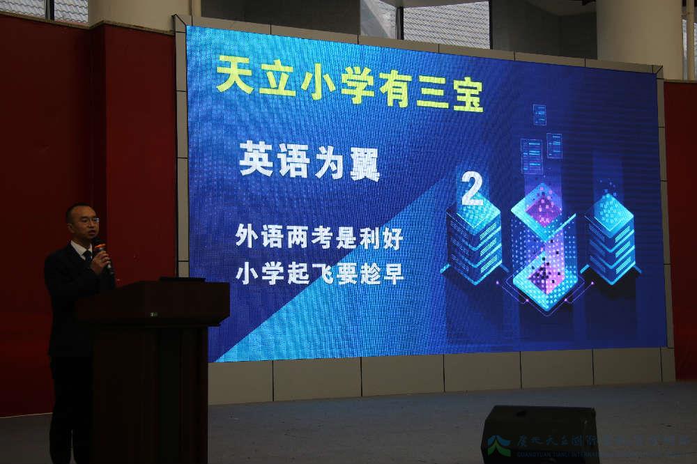 - 英语为翼:天立小学明确6-7岁这个年龄阶段是孩子语言学习敏感期,因此,学校引进美国superkids教材,提前构架低段英语课程体系,提升英语听力和口语。天立各个年级的孩子们已经习惯全英文课堂。汤校长用一组数据精确分析了天立小学英语课程体系化提前构架的优势:天立小学直升天立初中的初一年级一位学生英语水平已达到四级水平,小学直升班级英语平均分比其他班级高27分。这组数据充分证明天立小学部在孩子语言学习敏感期为学生积累起来的英语内驱力,从而实现厚积薄发。