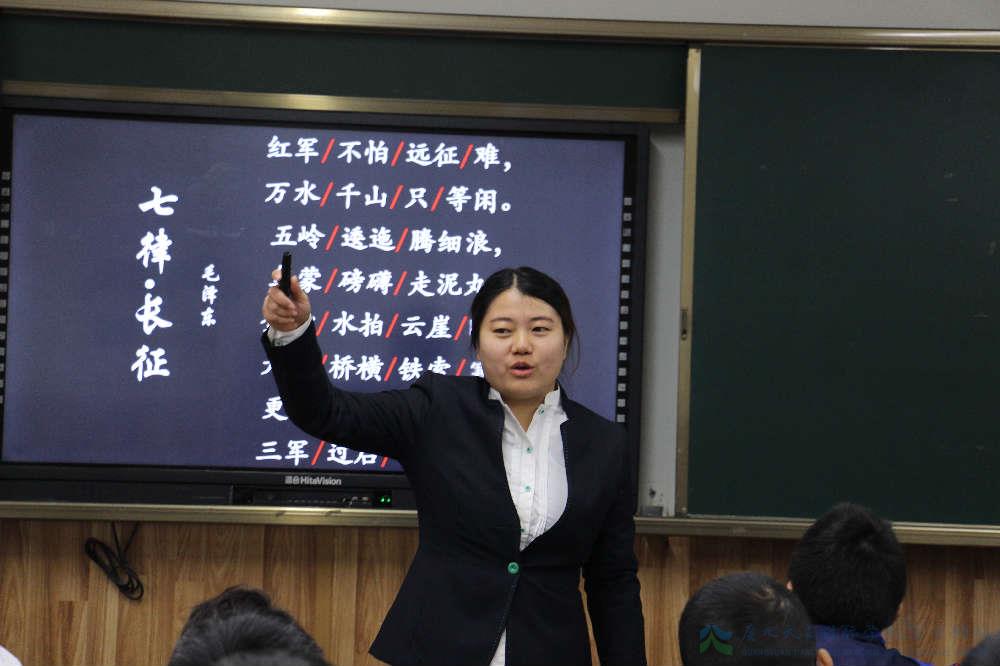 李瑶老师课堂:五年级上册最后一个单元是关于伟大领袖毛泽东同志的文章,主要体现了其伟人胸襟和凡人情怀。《七律·长征》是毛泽东同志在二万五千里长征结束时所作的一首诗,赞颂了红军战士的革命英雄主义精神和革命乐观主义精神。在课堂中,先一首《七律·长征》歌曲引入课堂,引起同学们的兴趣,随之由同学演讲毛泽东的相关知识,引入长征。紧接着检测预习,读写结合,落到实处,让每一个同学会读会写。再是小组合作解字译句,小组汇报时,给予每位同学展示自己的机会。然后小结本诗的思想意义,带领大家画地图,重走一遍长征路。在这个过程中,去感受长征路线之长,过程之艰辛,从而理解革命乐观主义精神。最后,所有人齐诵这首诗,感受本首诗的雄壮气势。