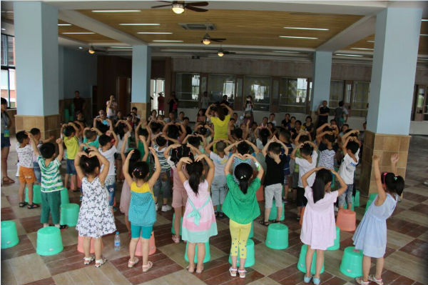 在热情的导游老师的引领下,大家秩序井然地步入雄壮的圆形艺体楼,敞亮宽大的篮球场,鲜艳的配色牢牢地抓住了大家的眼球,摸一摸,坐一坐,感受这座建筑的魅力。在离开的艺体楼时,细心的老师们送上了解渴的饮品,正所谓孩子是祖国的未来就需要我们无微不至的关怀。