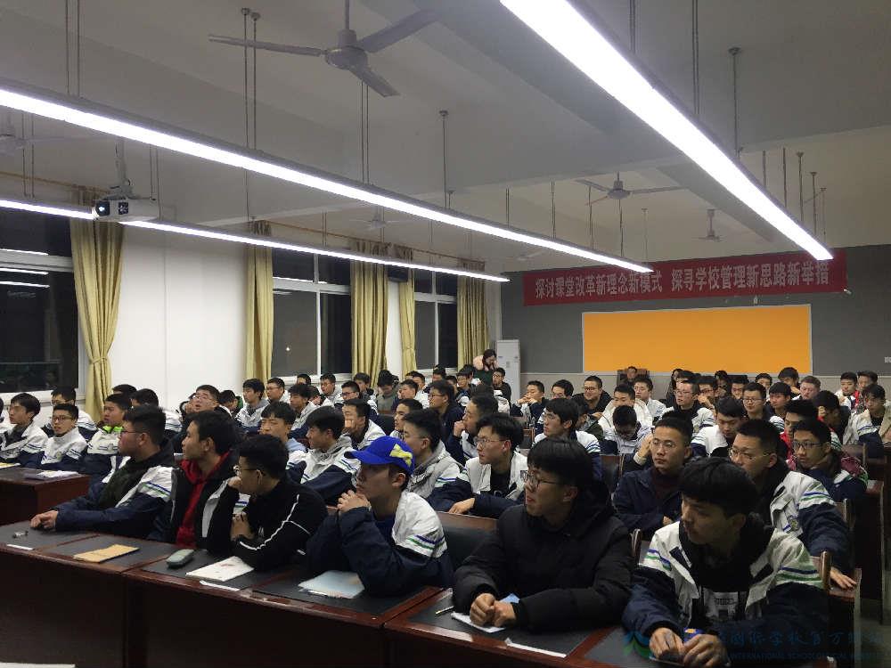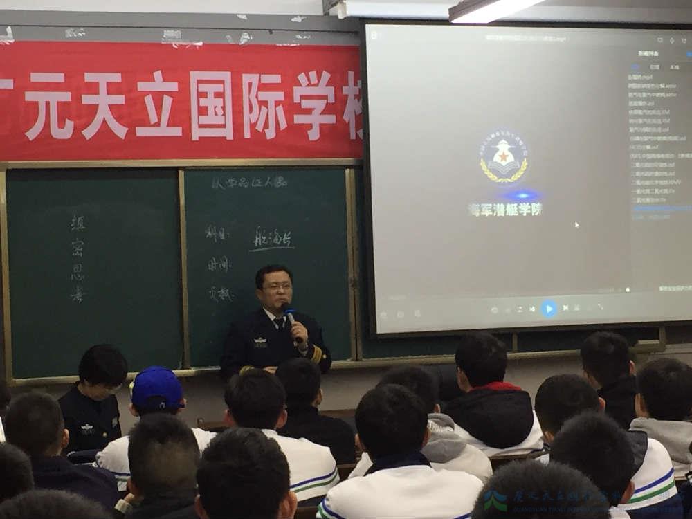 1月15日晚,海军潜艇学院戴教授和韩教授莅临我校为我校高中学子作专题报告,学校总校长黄永贵携高中部100余名学生参加。据悉,我校首届高中毕业生原2015级学生安南村在中考成绩并不理想的情况下,毅然选择广元天立高中,在2018年的首届高考中,凭借着自身的身体素质和优异成绩被海军潜艇学院录取,是我校低进高出的典型体现。