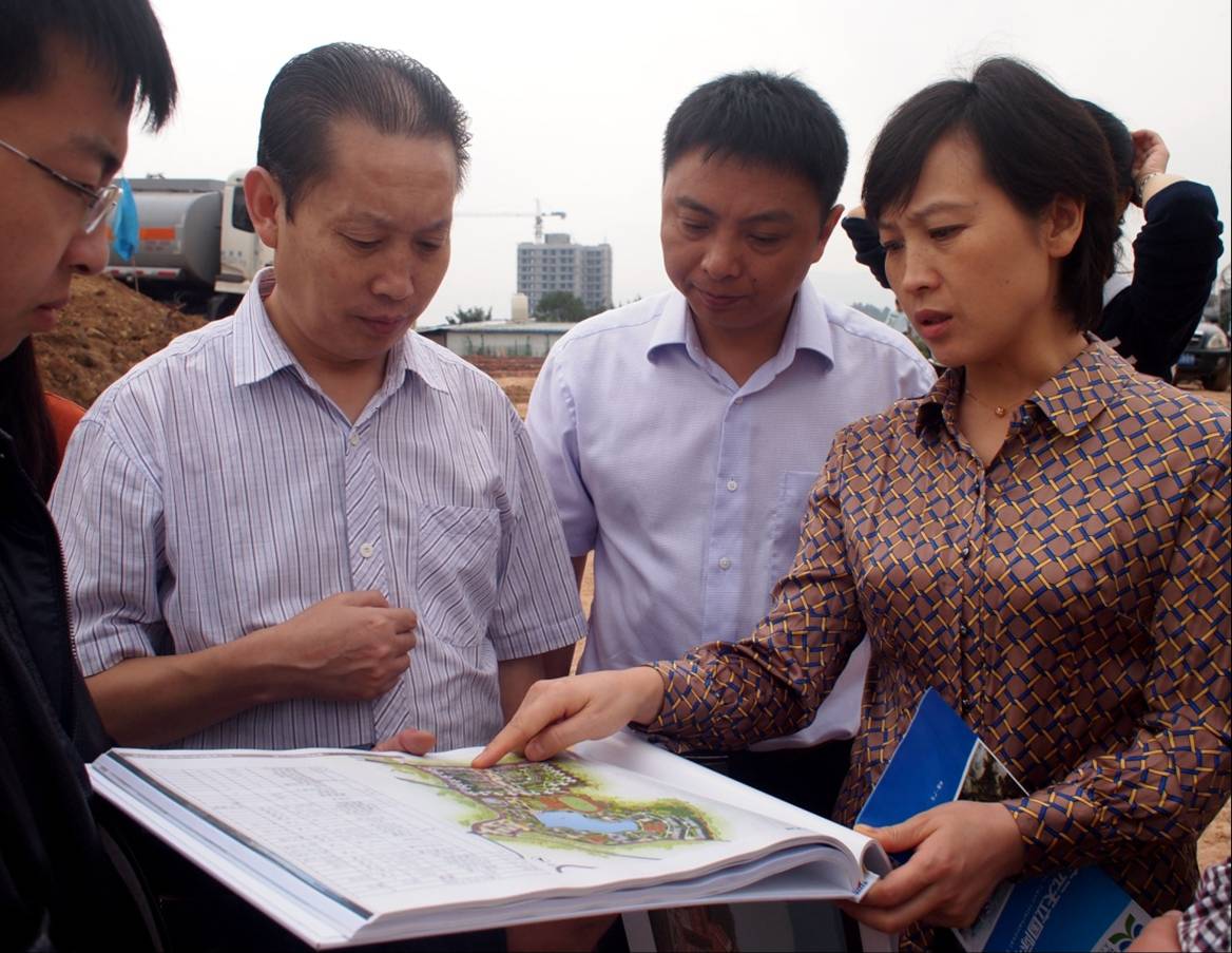 来到施工现场,王部长对学校布局作了详细的了解,她一边看学校工程效果图,一边比对施工现场,对学校建设中能够留住中间的一片水域(原莲花水库)给予充分的赞赏,对学校的硬件设施配备表示肯定。