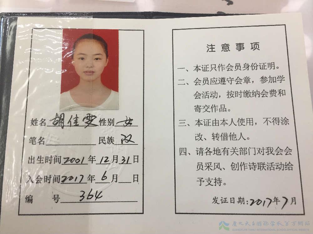 2017年11月18日,广元市诗词楹联学会第二届代表大会成功召开,会上为天骄诗社学生成员胡佳雯颁发了《广元市诗词楹联学会会员证》,并向天骄诗社赠送了刊物《广元诗词》。
