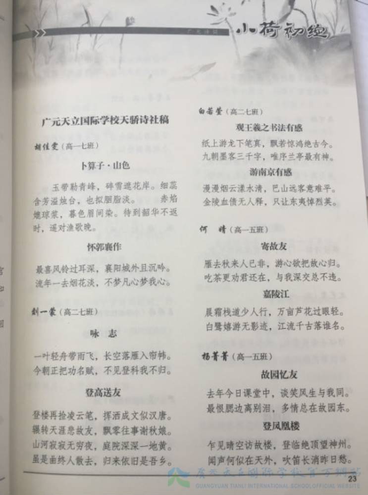 近日,广元天立国际学校天骄诗社主办的刊物《天骄诗韵》正式出版,该书收集整理了诗社师生成员的诗词作品200余首,作品质量得到了市内外各大文学社团组织的高度肯定。