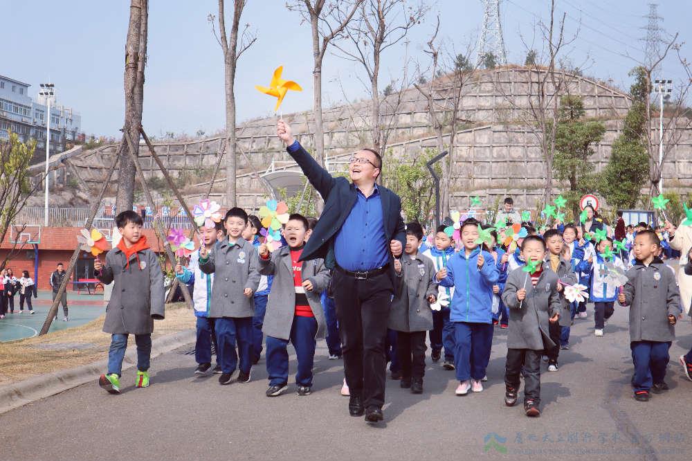 早在三月初,班队会上老师们向孩子们介绍风车的由来与传承,让孩子们以史为镜,传承梦想与快乐。中国传统的风车是由高梁的杆和篾,辅以五颜六色的五彩纸、浆糊做成。别看材料简单,但要把风车做得地道,还真需要点手艺呢!老师和家长带着孩子们制作手绘风车和亲子风车,亲身体验成功的喜悦与旋转的惊喜。孩子们设计制作的风车个性鲜明、色彩缤纷,拿在手里,甜在心里。