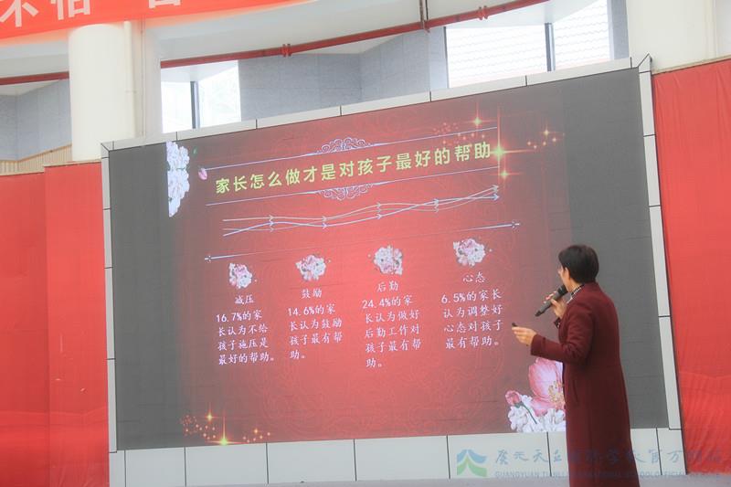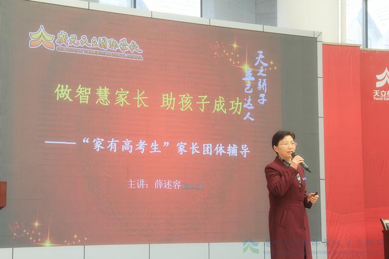 一年一度的高考即将来临,为了让我校高三年级广大学生家长更好地了解孩子的备考状态,正确对待孩子考前出现的问题,掌握一定的调节考试心态的办法,并学会与孩子沟通的技巧,形成家校教育合力,营造良好的复习应考氛围,助孩子一臂之力,圆孩子大学梦想,2019年3月29日下午,广元天立精英高中在学校艺体楼篮球馆开展了一场题为“做智慧家长,助孩子成功”的高2019届高三家长考前心理辅导。我校党支部书记、副校长兼人事部长薛述容女士主讲。