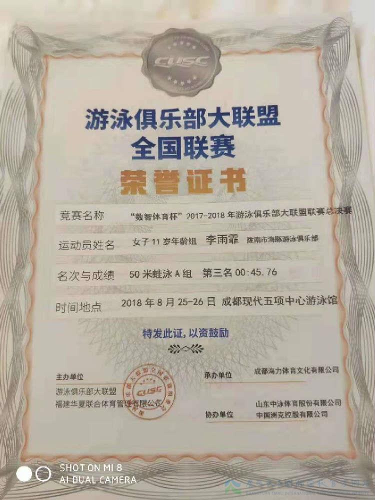重磅十:我校七年级李雨霏同学在“数智体育杯”2017—2018年游泳俱乐部大联盟联赛总决赛(女子11岁年龄组)中,获得50米蛙泳A组第三名,以优异赛绩成功入选今年二月国家女子少年游泳集训队!