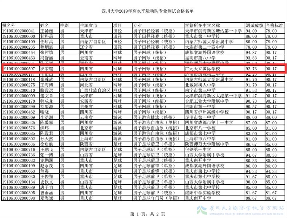 重磅十一:我校高三应届同学罗荣键以92.73分的高分顺利通过四川大学2019年网球高水平运动队测试,位列全省第二,成为广元应届高中高水平网球运动员同时通过浙江大学和四川大学专业测试的第一人,将享受今年文化成绩上二本线就可上川大,文化成绩上一本线就可就读川大口腔专业的优惠政策!