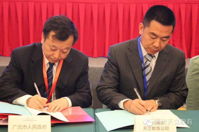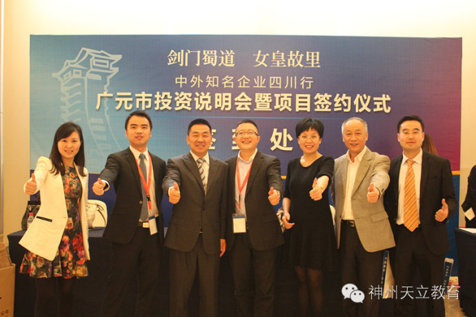 2014年4月9日,由四川省政府主办,四川省投资促进局、广元市委市政府承办的“中外知名企业四川行--广元市投资说明会暨项目签约仪式”的活动在成都新会展中心娇子会议中心天府厅举行。全国政协副主席王钦敏、省政协副主席高烽、广元市委书记马华、市长王菲及其他市级领导出席本次活动。在活动中,由副市长陈凯与神州天立教育集团董事长罗实签约广元天立国际学校项目。在签约仪式上,广元市委书记马华发表讲话,欢迎像神州天立教育集团一样有实力、有诚信的企业进驻广元,促进广元城市发展。并且将会优化投资环境、加大扶持力度促进企业更好更快发展!神州天立教育集团董事长罗实、投资发展中心总监庞晶晶、副总监龚元根、教育集团副总校长郭刚、杨昭涛等出席签约仪式。