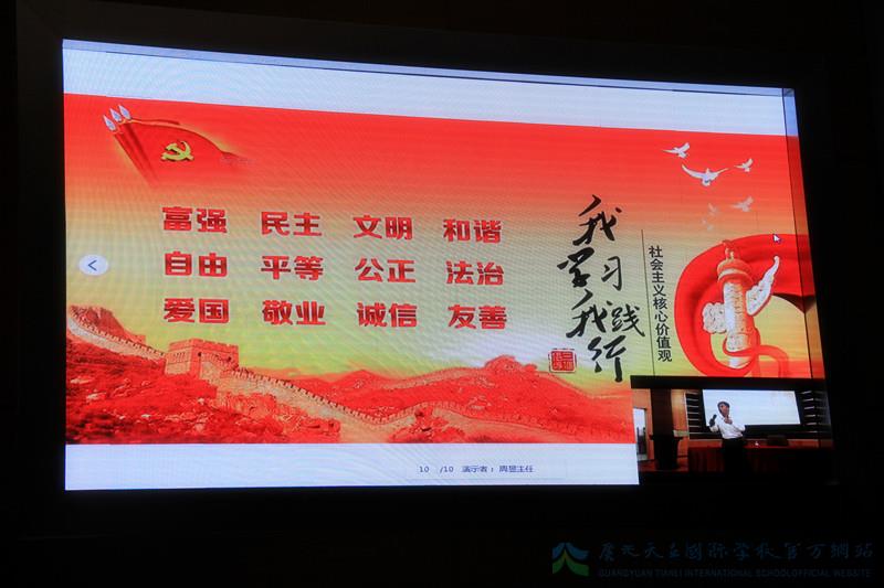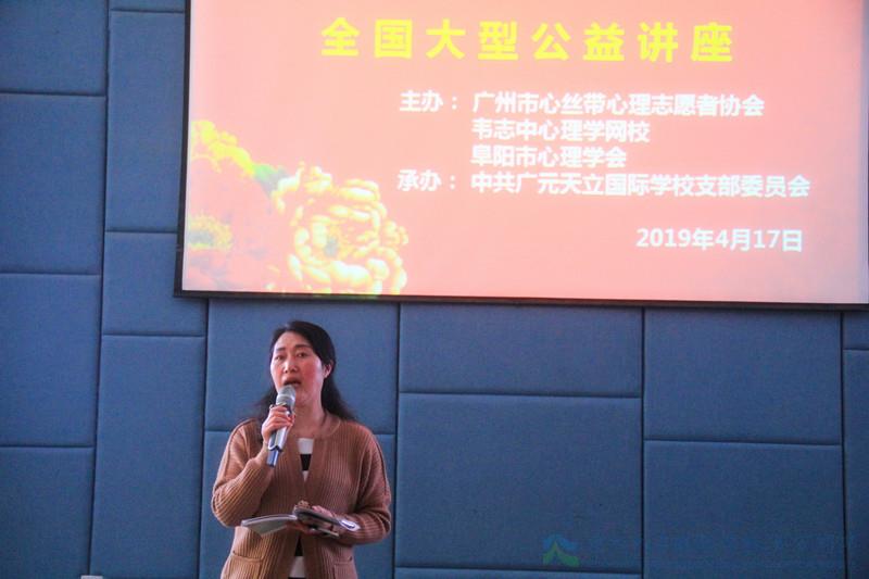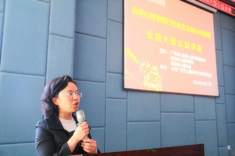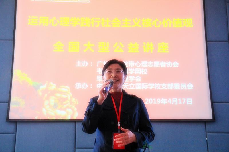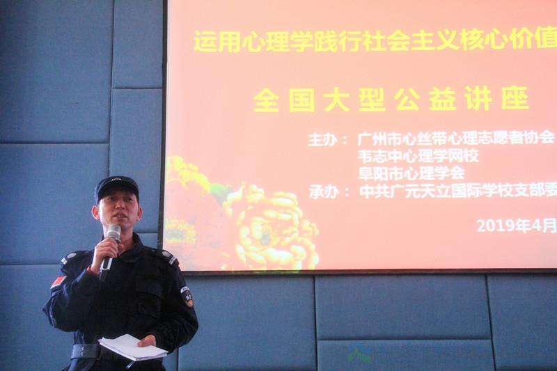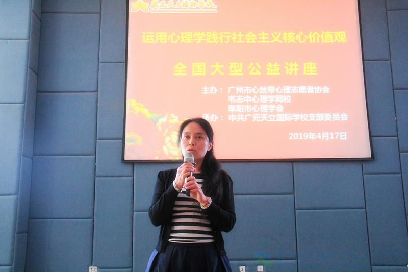 为深入贯彻党中央这一指示精神,4月17日,由广州市心丝带心理志愿者协会、韦志中心理学网校、阜阳市心理学会主办,中共广元天立国际学校支部委员会承办的《运用心理学践行社会主义核心价值观》全国大型公益讲座在广元天立国际学校举行,全校部分党员教师、后勤服务员工共100余人现场聆听讲座。讲座在全国共设分会场200余个,广元分会场活动由广元天立国际学校党支部书记、副校长兼人事部长薛述容女士主持。
