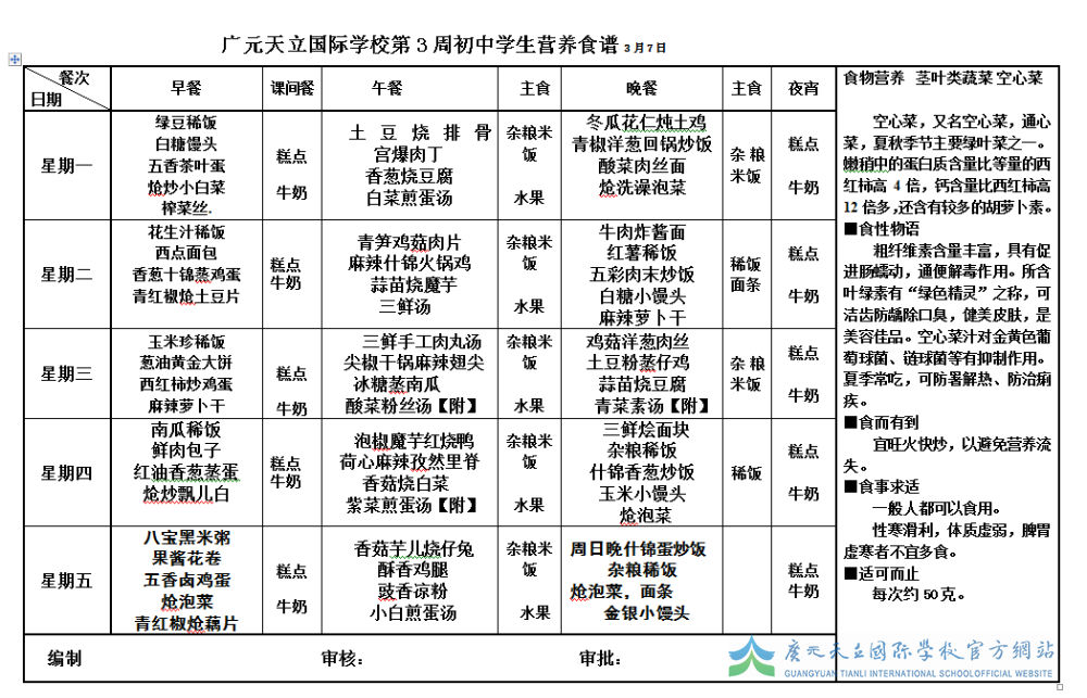 广元天立国际学校第3周初中学生营养食谱3月7日