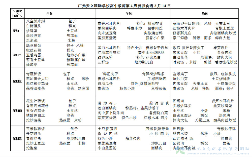 广元天立国际学校高中教师第4周营养食谱3月14日