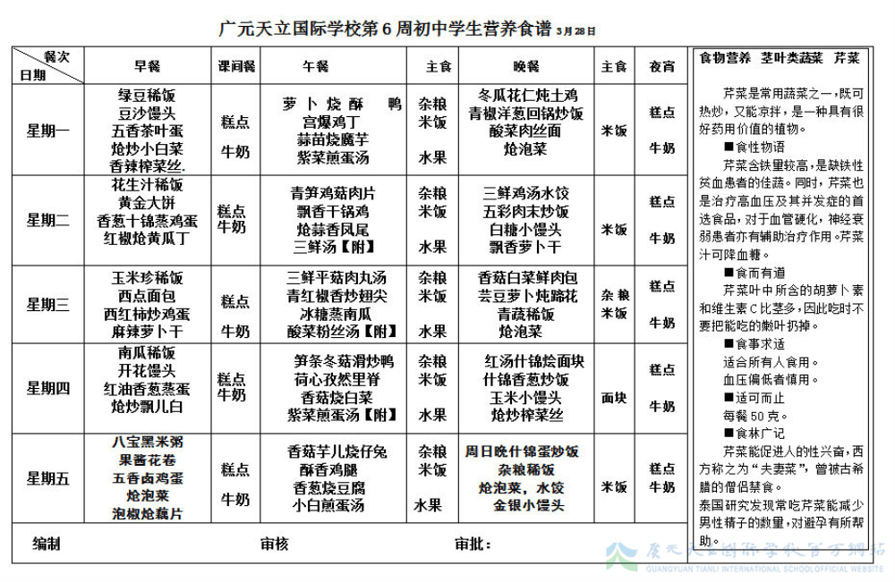 广元天立国际学校第6周初中学生营养食谱3月28日