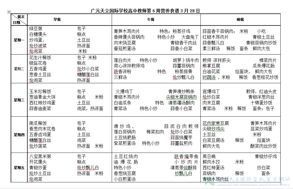广元天立国际学校高中教师第6周营养食谱3月28日