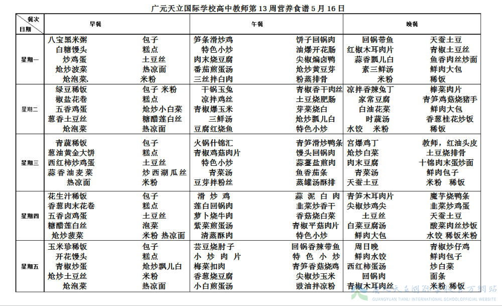 广元天立国际学校高中教师第13周营养食谱5月16日