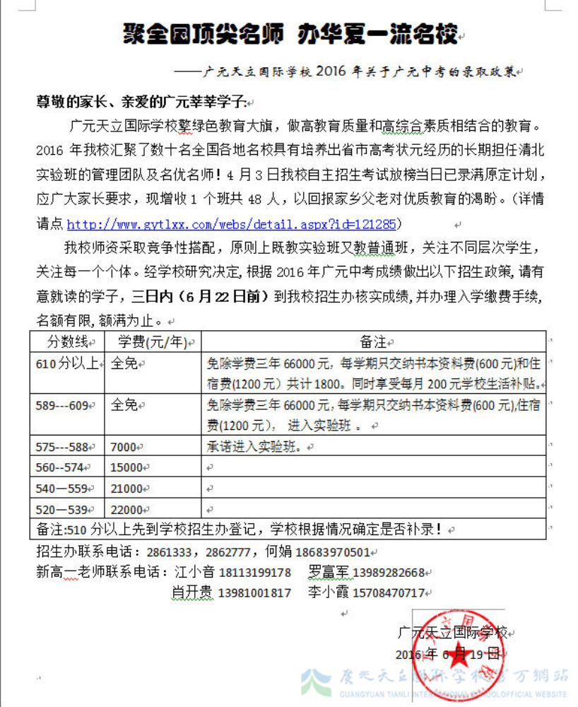 广元天立国际学校2016年关于广元中考的录取政策