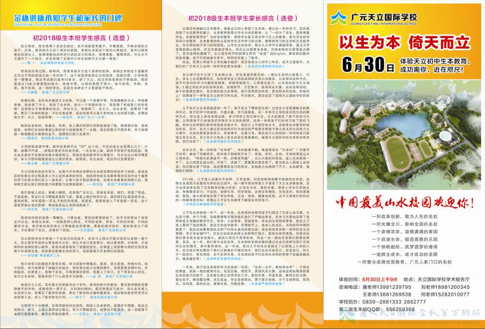 在此,我衷心希望天立学校越办越好!我还希望女儿初中三年后,在天立读高中,为我们的广元有天立这样一所好学校更加自豪! (生本班杜潇阳同学妈妈)