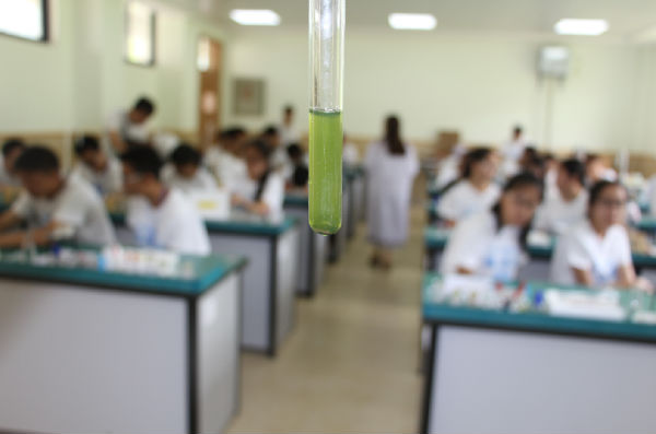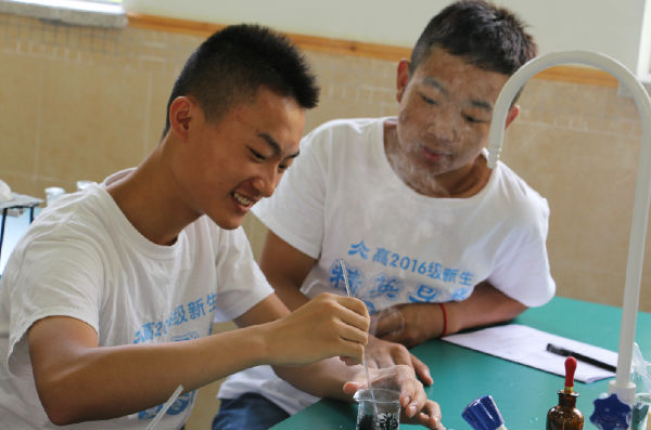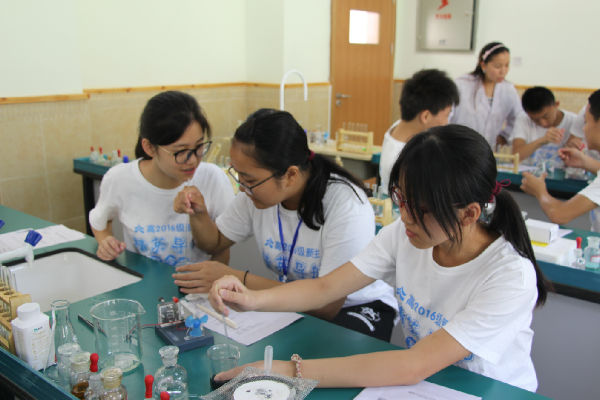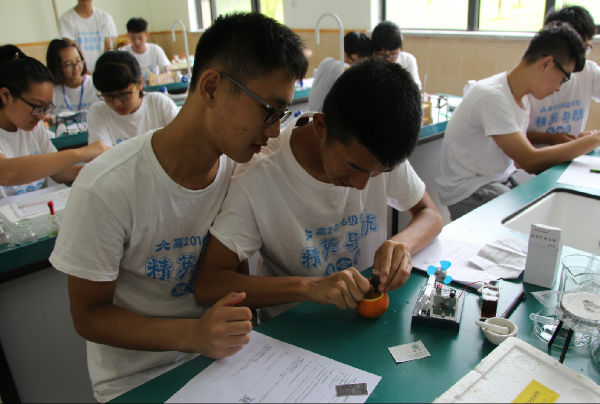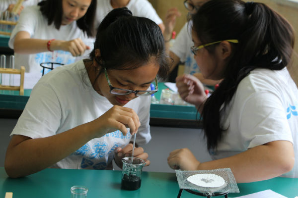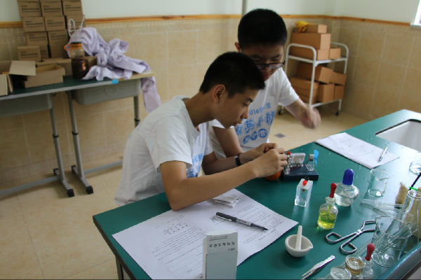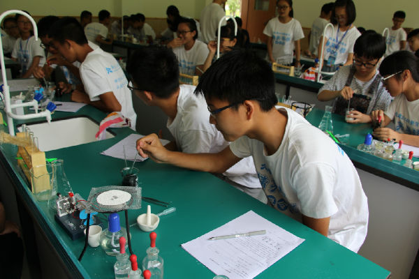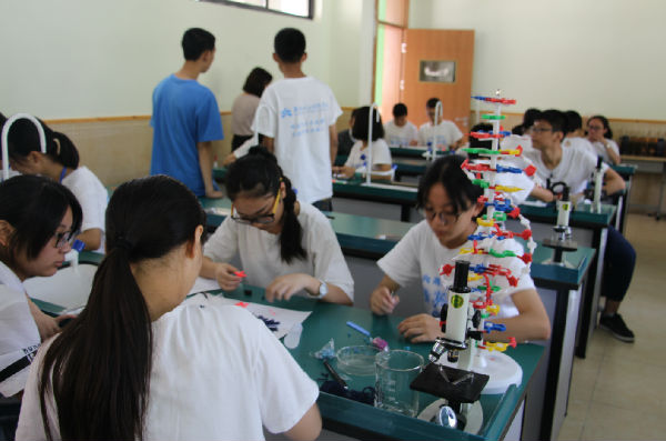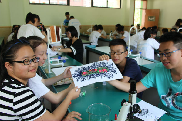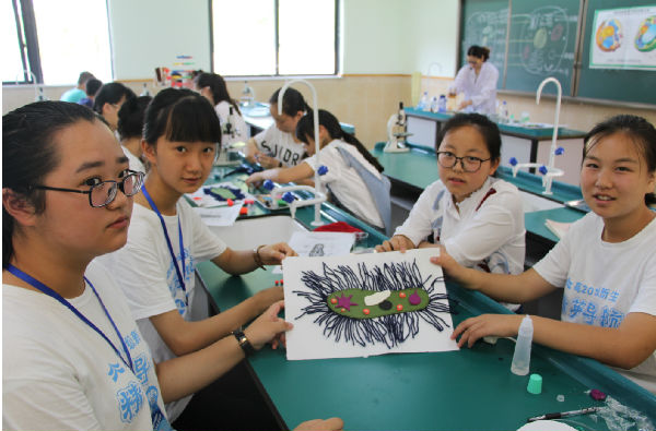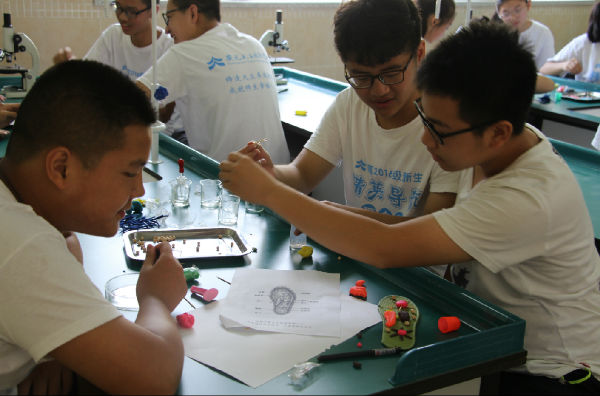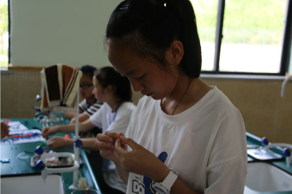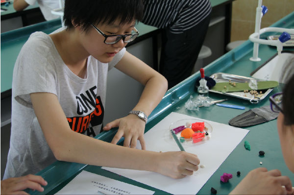 都说兴趣是最好的老师,因为它可以为学习导航,能够让热情膨胀,特意安排在前期的生化实验正是出于这样的考虑。告别前两日的实验惊喜,今天的化学实验间再次受到同学们的关注。从葡萄皮中萃取的汁液,紫得让人迷恋。当它遇上试管中的氢氧化钠,酸与碱的碰撞让绿色的呈现成为颜色完美的蜕变。静待葡萄酒的酿制时,生物实验室继续进行着新与奇的较量。当模型展示在大家面前时,他们的脸上写满了迷茫。以为是绣花鞋垫的同学们在得知是草履虫结构后,以不言而喻的神情传达了自己的惊叹。