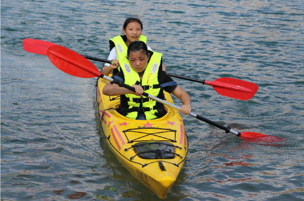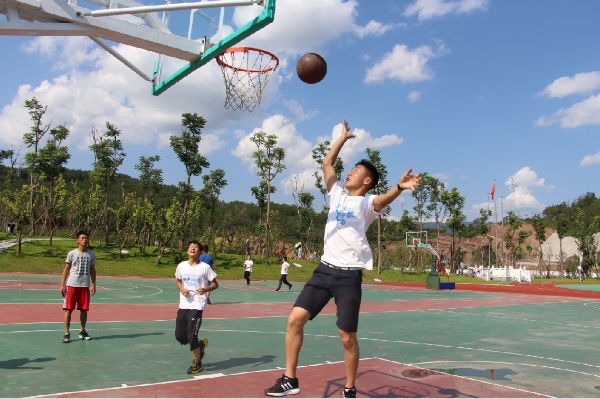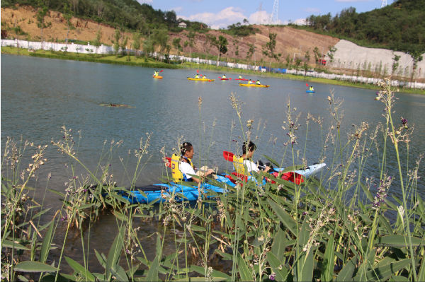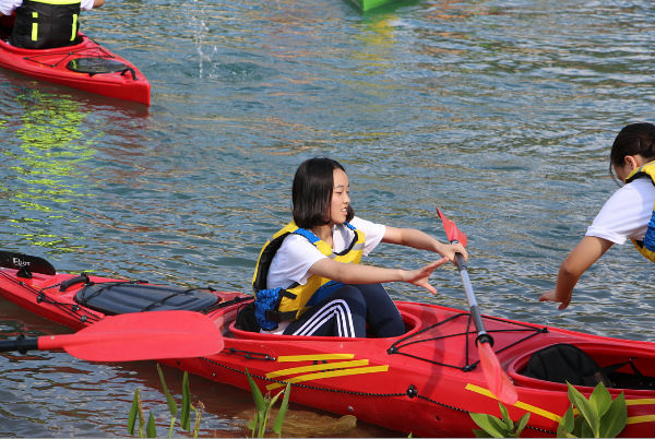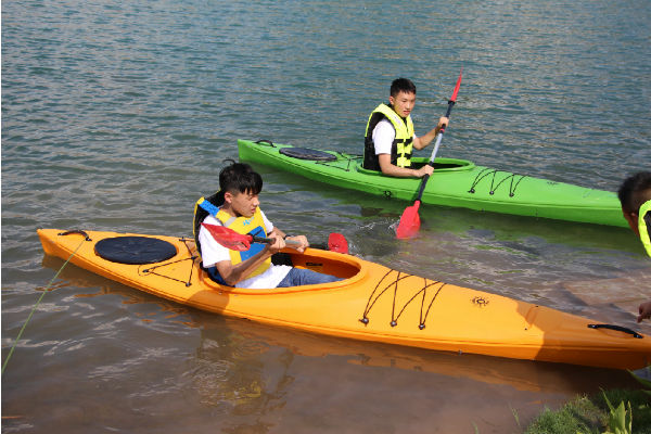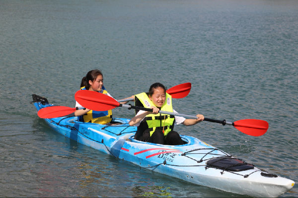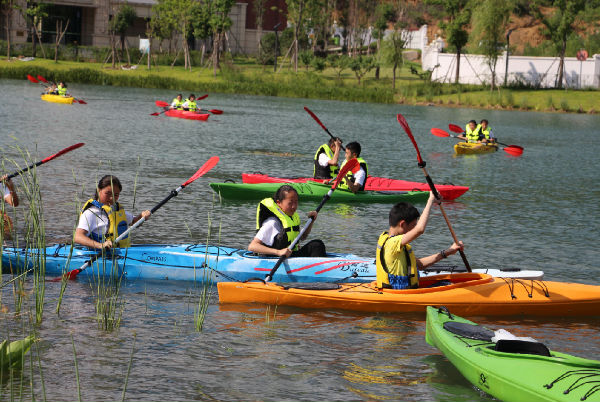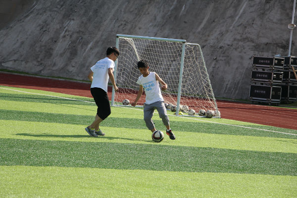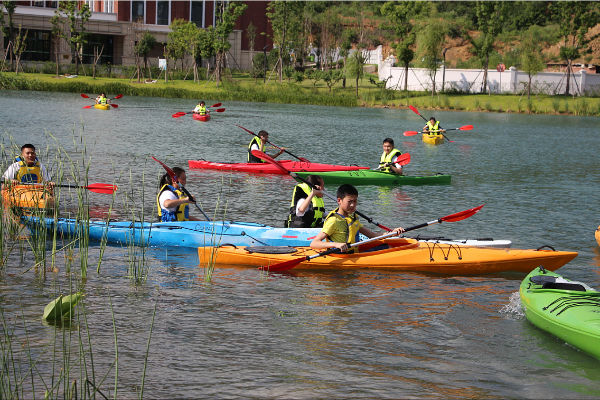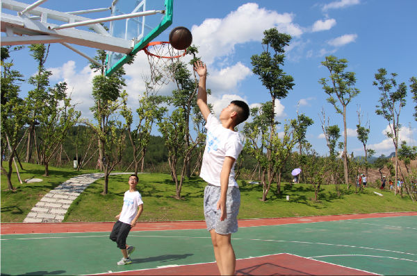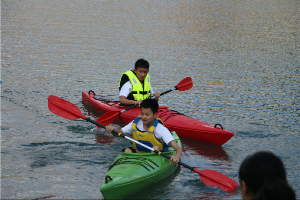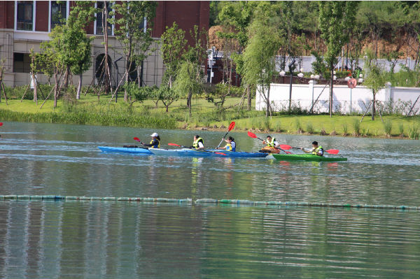 青山绿水,碧瓦红砖。天鹅曲项,小艇荡漾。师生咸集,泛舟湖上。昨天的皮划艇课程因为突降的大雨而转向室内,仅仅通过视频的观看,怎能满足学员激动的心?意犹未尽中,同学们们早就迫不及待、跃跃欲试。在王教练的带领下,两个营的学生齐聚天鹅湖畔。早就按耐不住的同学们在教练的讲解后,立即投入训练之中。一声哨响,停止船桨;两吹哨声,双艇相伴;三响齐下,安全靠岸。暑天炎炎,与湖水清凉的触碰,让袭上心头的疲惫荡然无存。尖叫、嘶吼,船桨拨动碧水的声音,相互交织,让天立校园再次有了人与自然融合的完美呈现。因为场地的绰绰有余,球类选修课也搬向了室外。不论是篮球的传递、上篮,还是足球的配合、射门,无不彰显天立学子的青春力量。