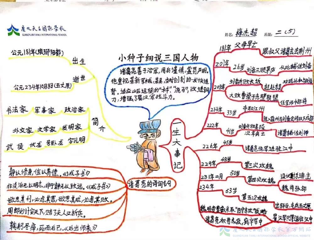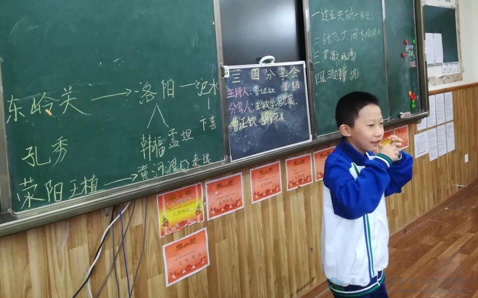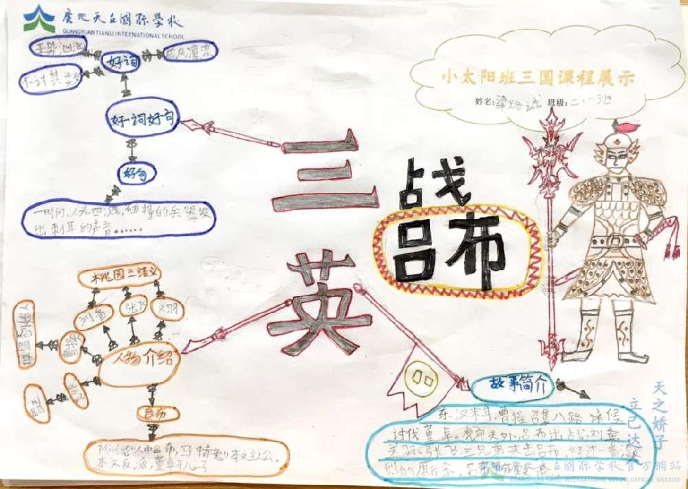 在三国主题阅读的同时,各班级通过开展主题阅读辩论会、周内、周末三国主题读书会等各种读书会引导学生吸取三国文化中的精华;语文组设计三国主题阅读课程,梳理三国知识思维导图,编排三国情景剧,带领孩子去户外开展三国主题研学旅行,绘制三国地图,让孩子在读中思,做中学,行中悟;美术组老师设计三国主题美术课程,让孩子在线描画、纸浆画、彩铅画、剪纸画等美术作品中深刻地理解三国文化所体现的厚重的历史文化。