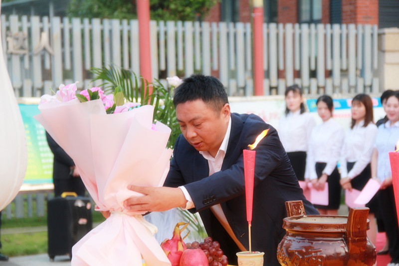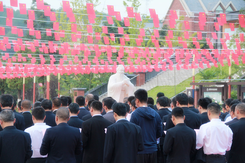 我等裔孙弟子,感念祖德,缅怀师恩,祈祷中华儿女:慎终追远,民德归厚,仁爱满人间!当晚6点10分,祭孔典礼在校门口孔子广场准时启幕。伴随着《祭孔乐舞》,主祭人黄永贵总校长净手向孔子像献花、上香、祭酒并领诵祭文:“金秋飒爽,云淡风清;和谐盛世,家道常兴;先师圣诞,九州恭迎……”全体教师虔诚行三鞠躬礼。一鞠躬,拜谒至圣先师,发扬尊师重教的传统美德;二鞠躬,表心意继往开来,传承光大孔子的教育思想教书育人;三鞠躬,立志向为人师表,把自己的人生融入到建设富强民主文明和谐的社会主义现代化强国中。大家以拳拳初心感知先哲思想的光辉,坚定天立教育的信念,践行天立教育的追求,守望天立教育的净土。
