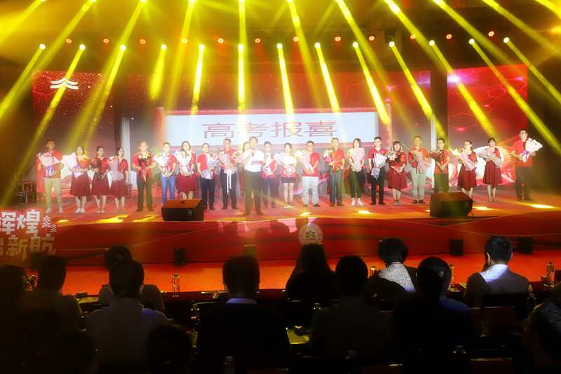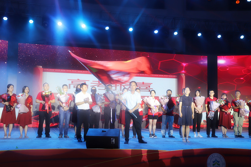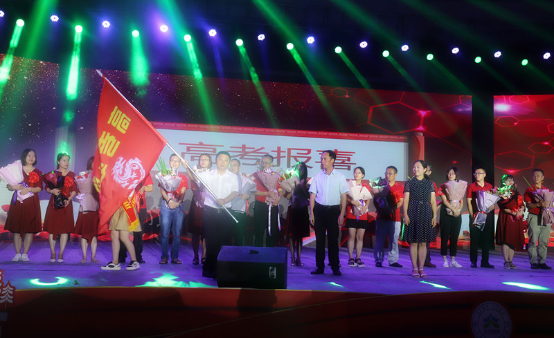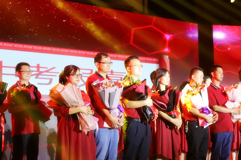 报喜环节,高中部范玉钦校长和初中部杨邦卿校长,依次各自带领高三、初三教师团队登台,向到会人员隆重报喜,接受大家对功臣的喝彩与礼赞,学生代表对英雄们献花!