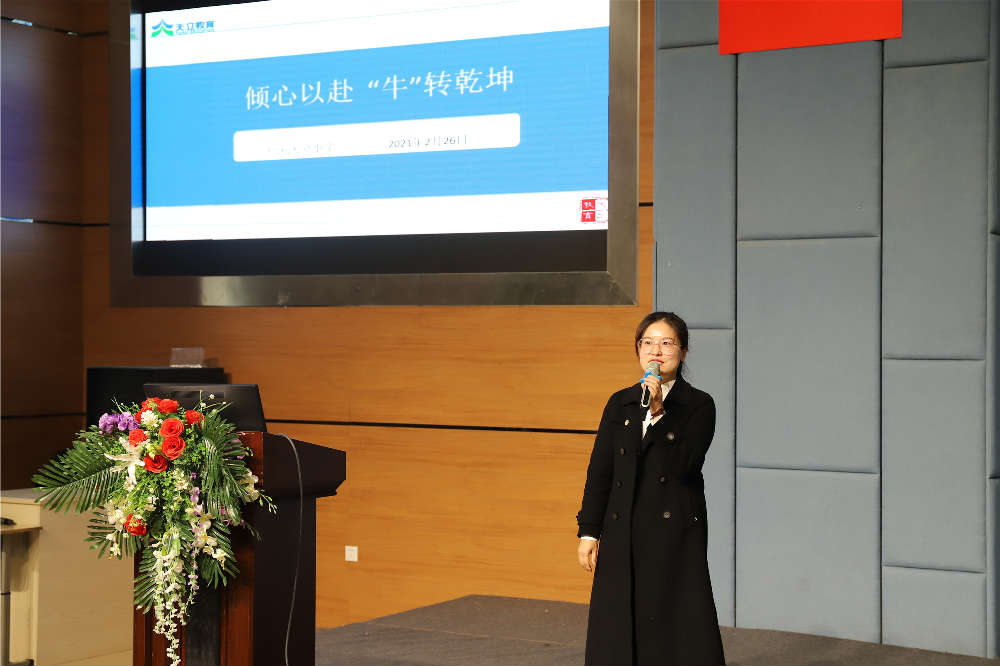 广元天立国际学校总校长黄永贵先生以“广元天立2021年教育风向标”为题作总结性的激情讲话。讲话中,黄校长说:“2021年为牛年,祝愿大家牛年吉祥如意,牛年牛气冲天,牛年敢吹牛,年年是真牛!梦想的原名叫‘吹牛’,梦想的远方叫‘真牛’。作为广元天立,牛年要有一股牛劲,就是要抓住牛鼻子,就要发挥老黄牛、拓荒牛、孺子牛的精神,打造广元天立新年年度教育风向标,绘就广元天立2021年工作蓝图!”同时,他从“集团及学校文化的学习与践行”“推行集团七步工作法,加大学校行政规范力度,让七步工作法成为大家的工作方式”等多个方面,对2021年学校质量发展目标、课程建设目标、课堂改革目标、规模发展目标、家校共育目标、师生幸福工程目标、特色建构目标等进行了系统阐释,并提出了具体的工作举措,赢得了全体教职工的高度认同与赞许,其精彩讲话五次被大家的热烈掌声所打断。