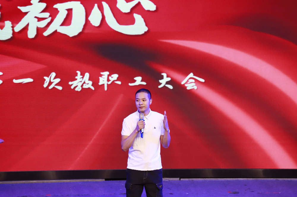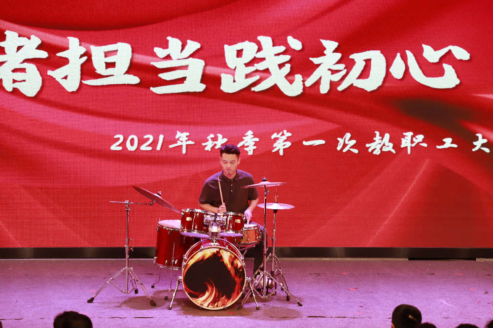 伴随着温情的旋律,大会在2019年天立教育集团歌手大赛中荣获前三甲的初中新进音乐教师谭力文,高中人事行政处主任兼团委书记、音乐教师王晨,小学学生发展处副主任、新进音乐教师丁伦杰三位老师共同演唱的经典英文歌曲《you raise me up》中正式启幕。在今秋新加盟我校的优秀架子鼓教练耿嘉豪老师的合奏下,三位青年教师再次高歌一曲青春励志歌曲《奔跑》,整个演唱气势磅礴、坚定有力,四位青年才俊的精彩表演,惊艳、感染、点燃全场。歌曲唱出了天立教育梦想的力量,鼓点振奋了天立人不畏风浪、敢于拼搏的精神,也很好的演绎和揭示出了本次大会的主题——“同心共筑教育梦,师者担当践初心”。