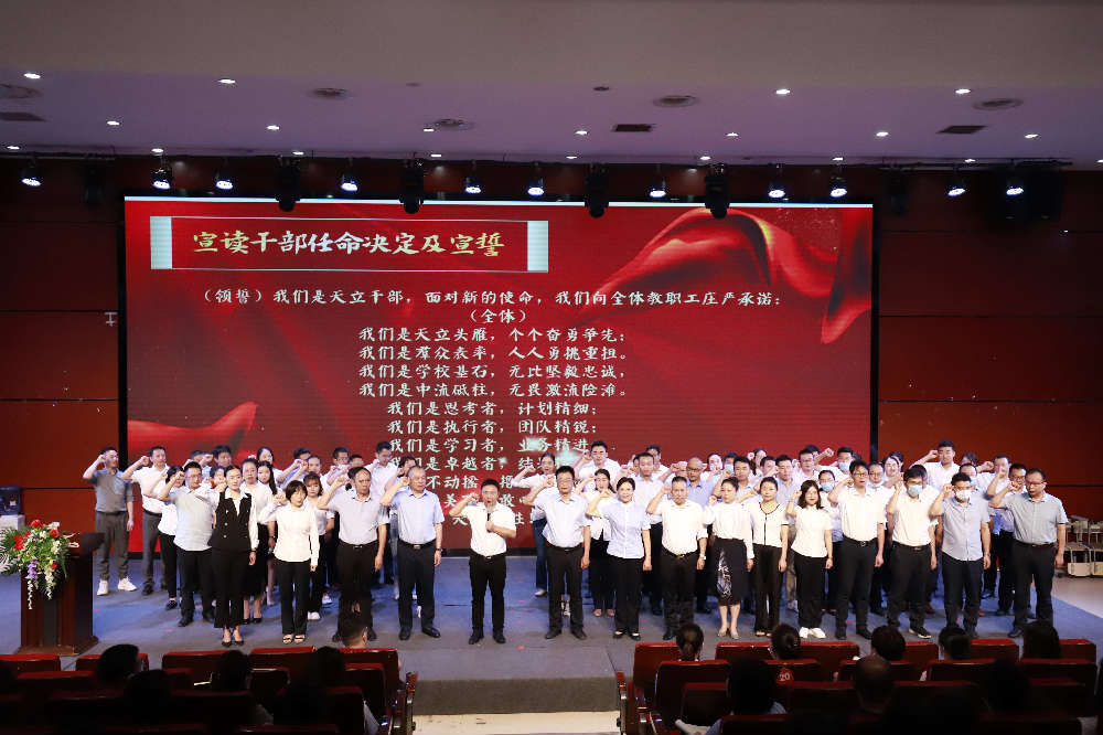 黄永贵总校长宣读2021至2022学年度学校干部任命决定。并强调,在新的学年,在新的环境和岗位上,全体行政干部要从自己的职位认知切入,结合新时期和新形势下学校发展的实际情况,以“精致化、系列化、长期化”的工作表现来敬畏单位、敬畏团队、敬畏岗位、敬畏职责、敬畏制度,要从自身带头做起,做部门的标杆、做教职工的榜样,以一流的管理缔造最优质的教育,创办全省全国一流名校。