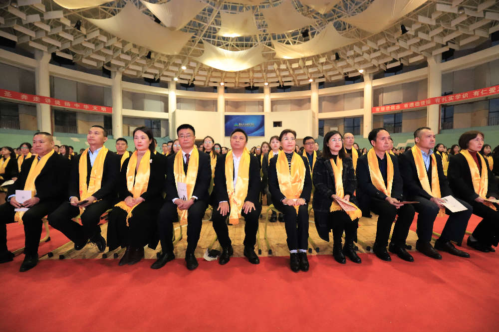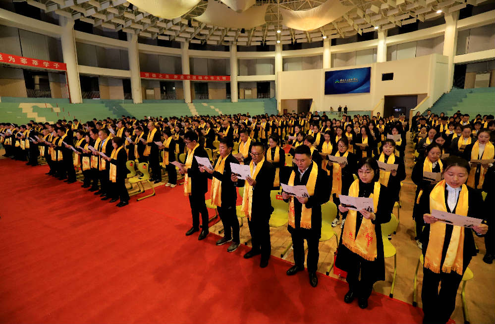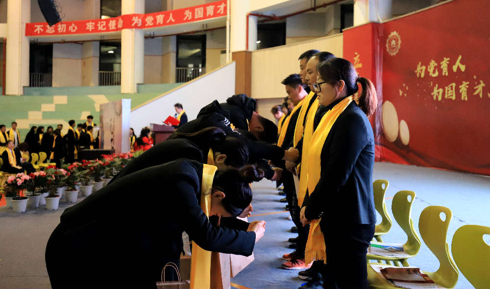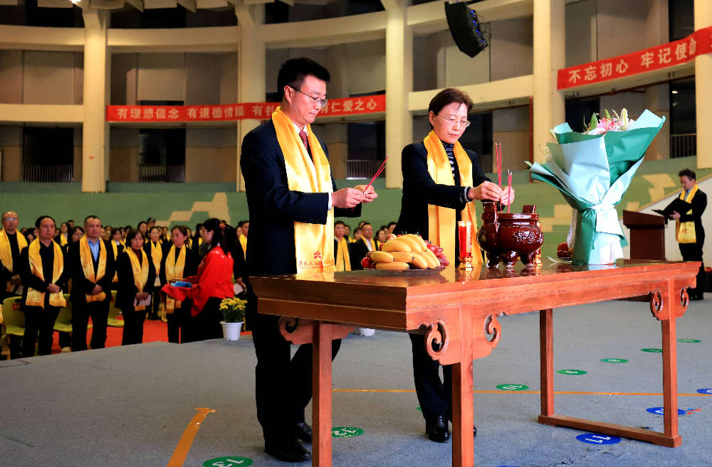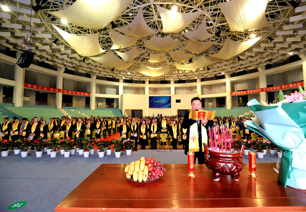 为纪念这位“万纵之圣”“天之木铎”,10月13日晚,广元天立学校在学校艺体馆以祭孔拜师、师徒结对的独特方式纪念孔子诞辰,不忘初心、牢记使命,为党育人、为国育才。高中部人事行政处主任兼团委书记王晨、小学部四年级年级主任古娟主持典礼和仪式。当晚,全校党政干部、专任教师、生活教师、行政后勤处室职员整束衣冠,统一佩戴黄色围巾,谨以鲜花果蔬美酒、鼓乐合鸣,满怀崇敬之情,肃立孔子像前,举行祭孔大典,纪念“至圣先师”孔子诞辰2572周年。祭孔拜师典礼在小学部选送的精彩节目“诗朗诵”中隆重启幕。祭孔大典中,一切随典而动,礼乐和鸣,庄严肃穆,让全场人员的身心俱得中华传统文化的充分沐浴!