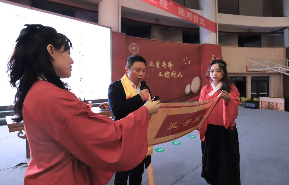 小学部常务副校长兼五年级年级主任凡小容,学校副校长兼初中部校长范少勇,学校课程质量部副部长、初中部副校长兼教师发展处主任蒋万甫,宣读2021-2022学年度小初高三个学部师徒结对名单,并颁发聘书。全体徒弟向师傅敬献拜师贴、行拜师礼,师徒互赠礼物,师傅给徒弟赠送青年教师发展手册,徒弟给师傅赠送自备的礼物。从此,师徒结对携手共进,不忘初心砥砺前行。