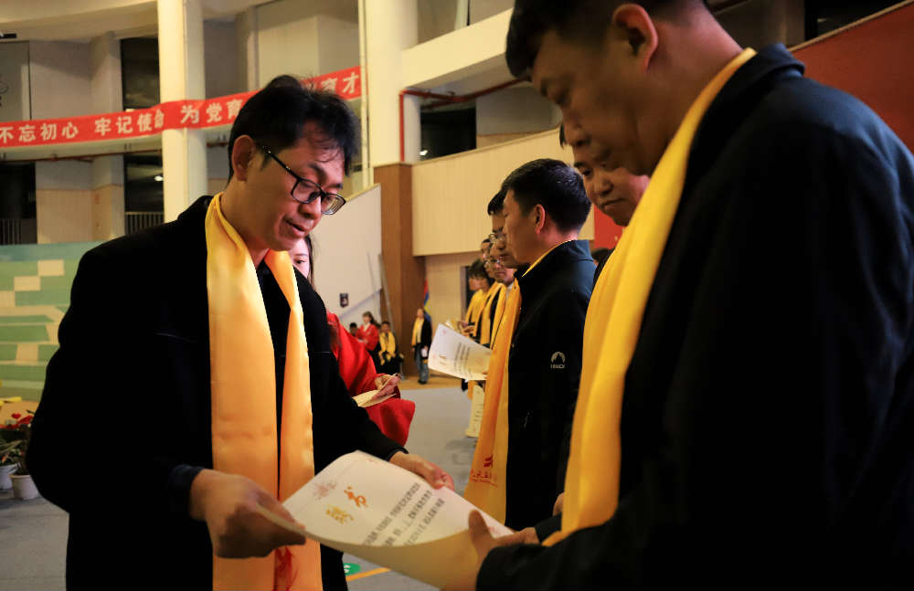 “构建天立专业化教师团队,青蓝工程重担我们挑!化压力为动力,以真情换热情,师傅带徒弟,薪火代代传!爱岗敬业,乐于奉献,为人师表,以身作则,榜样示范,履行职责!教无止境,学无止境;全面关心,全力指导。教学相长,智研同修;互相学习,共同探讨;彼此听课,取长补短。倾囊相授,毫无保留;指点迷津,亲身示范;严格要求,携手共进……”初中部副校长刘俊代表新一届师傅发言。