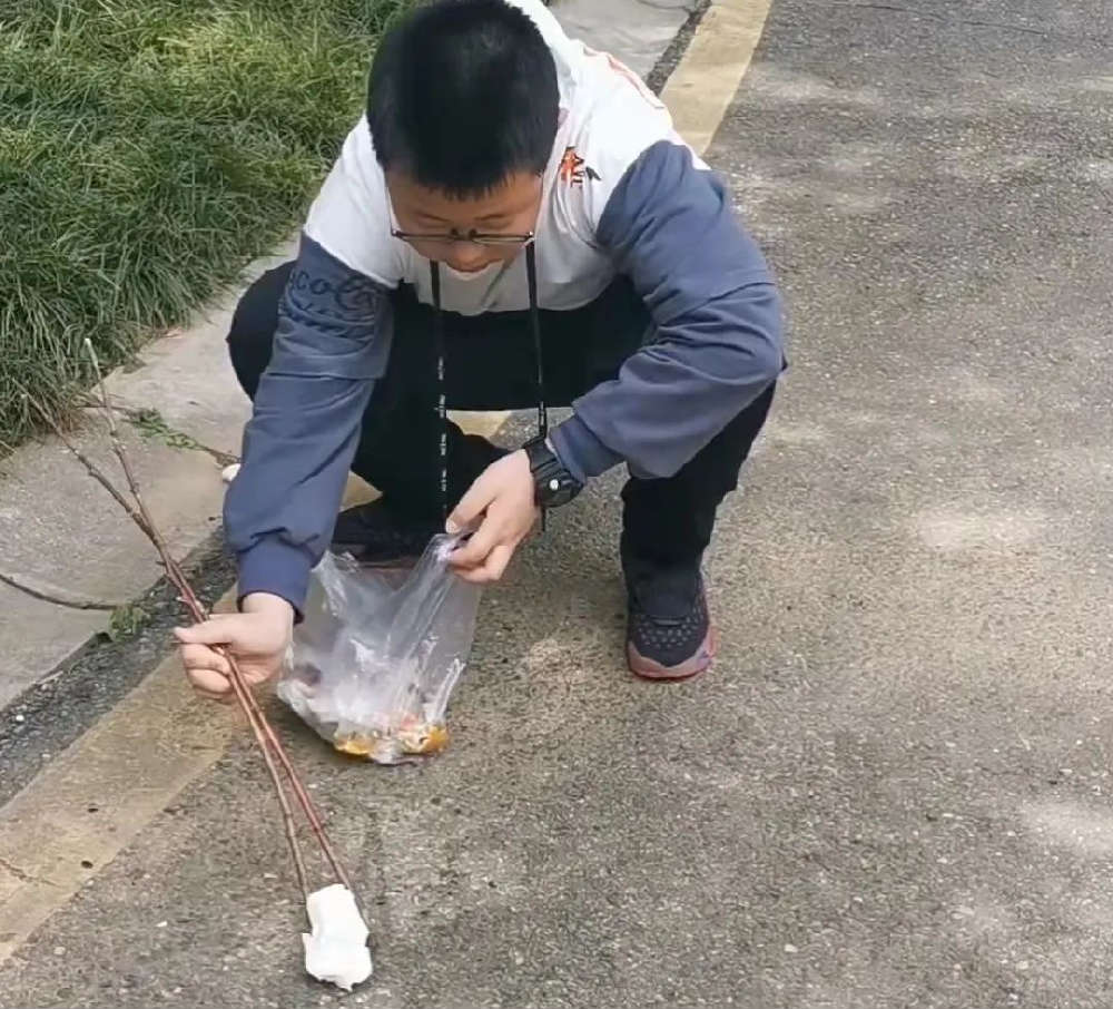 我在路上捡垃圾,戴着手套,拿着口袋,不一小会儿,口袋就满了,于是就把它扔进垃圾桶,这样一直反复着,干了三十多分钟,我已经累得腰酸背痛。