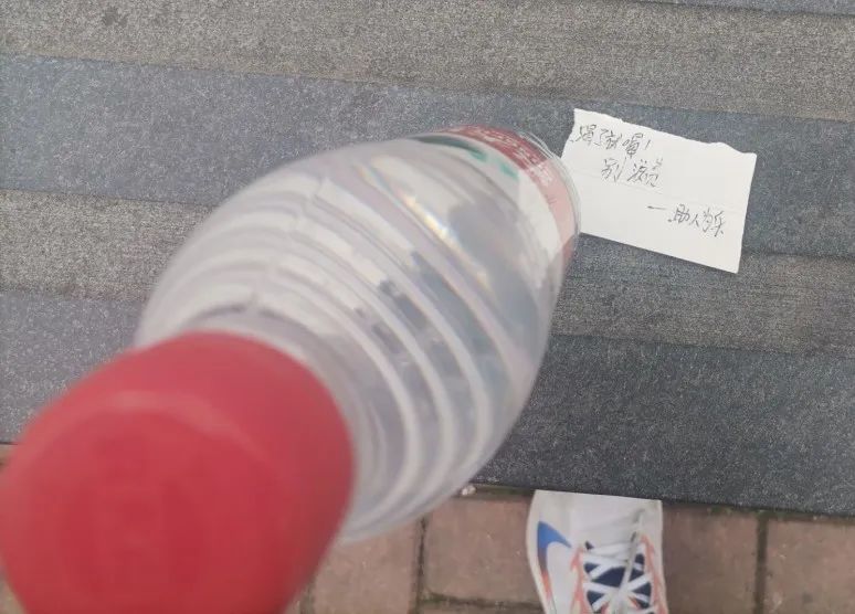 冯则元:我跑了两条街,实在找不到环卫工人,所以说就买了瓶水,问店家借了笔和纸条,然后放在路边,谁可了?看到就喝就行了,不知道这样算不算