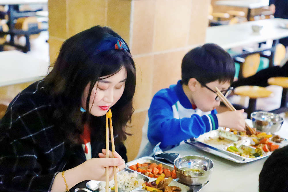 餐厅整洁明亮,环境干净卫生。已消毒的餐具整齐摆放在每个窗口。步入食堂操作间,家长们目睹食堂工作人员身着洁净工作服、戴着专用工作帽、全程佩戴口罩和手套,技艺娴熟却又严格按照食堂操作流程精心准备孩子们的饭菜。为让每个孩子都吃得营养、吃得安全、吃得健康,食堂工作人员每天重复着这些看似简单操作,却因心怀每个孩子吃饱吃好吃健康而乐此不疲。