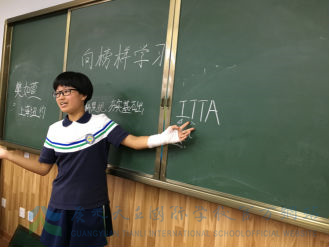 如约而至的十位同学可做足了准备,教师范儿十足地站在讲台上与同学们侃侃而谈。尹子航、张宇昊同学你一言我一语用风趣易懂的语言向同学们分享了“定目标”、“理解性记忆”、“遵照老师教导”以及“合理安排学习时间”四个学习关键词的重要性。穆治含同学则从学习态度入手分享她的学习心得,她认为进入初中阶段我们首先要改变“为老师学、为家长学”的态度,而应树立“学习是自己的事”的态度,“想学”、“勤学”、“会学”就是对自己负责。任祯仪同学则分享了对她帮助特别大的两个方法:常纠错以及迎接竞争对手的压力。樊如萱同学以“忌学科模式,夯实基础”为关键词对语数外三门学科分别展开了论述,分享ITTA(idea想法,team团队,timing时机,action执行)的成功理论,也同大家分享了变压力为动力的心路历程。
